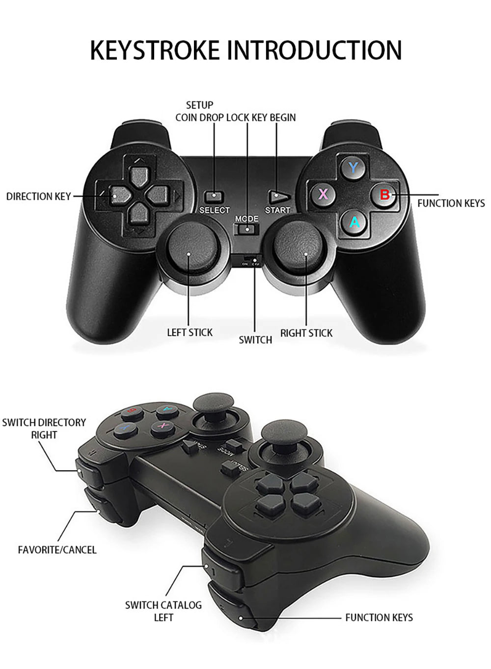 Setup Instruction:1. Plug the receiver and usb cable to the stick,2. Connect the usb to the usb port of TV or any power bank for power supply,3. Plug the stick to TV HDMI port and play,4. Press Select and Start button together to return main menu