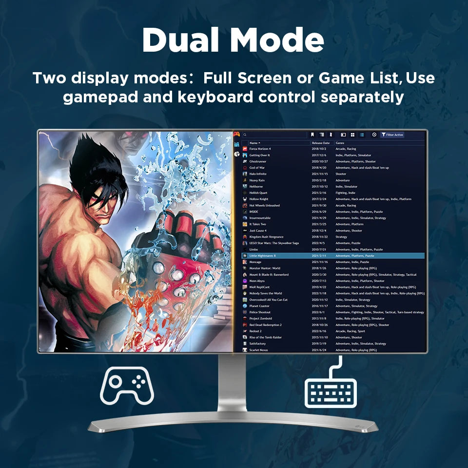 Two display modes can be selected, full screen or list, and controlled by joystick and keyboard respectively. Both displays have their benefits:you can choose the game you are interested in through the game list, and the full screen display will give you a better understanding of the game.