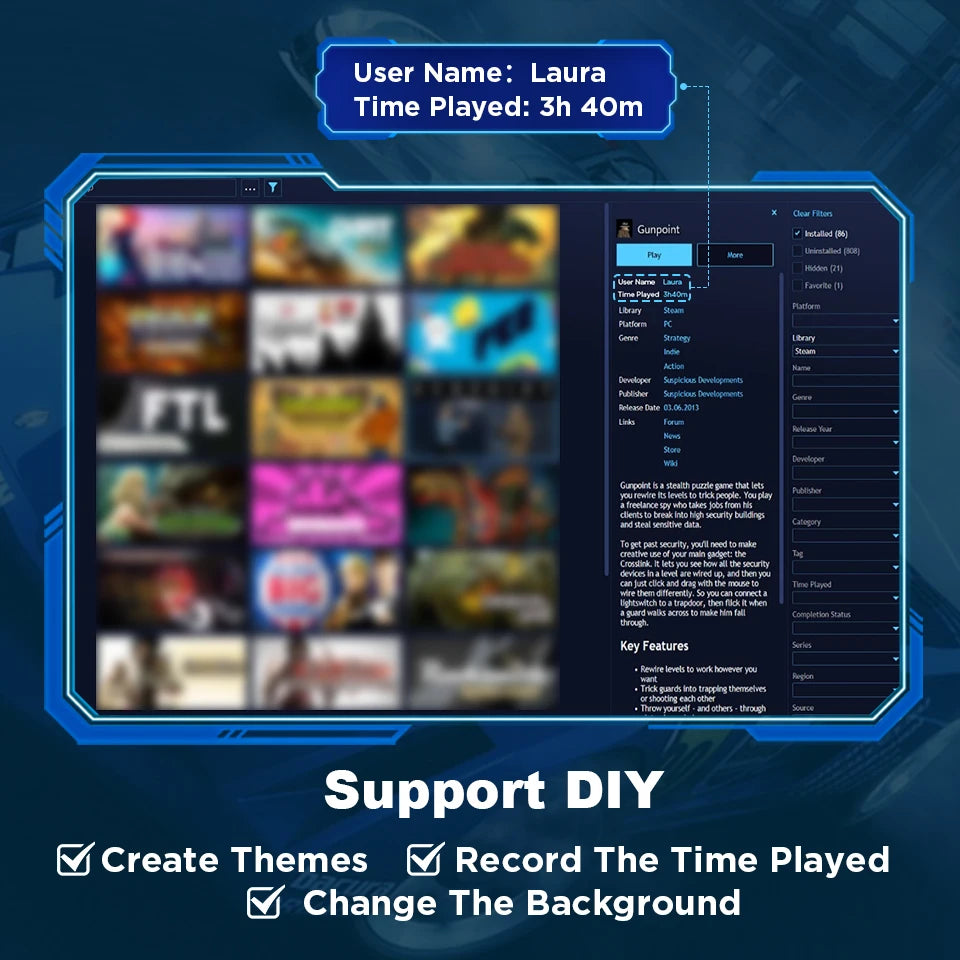 In Playnite system, you can add or even create your own themes, add favorites, record game play time, change game profiles and background images, support adding your own original games to playnite and customize it