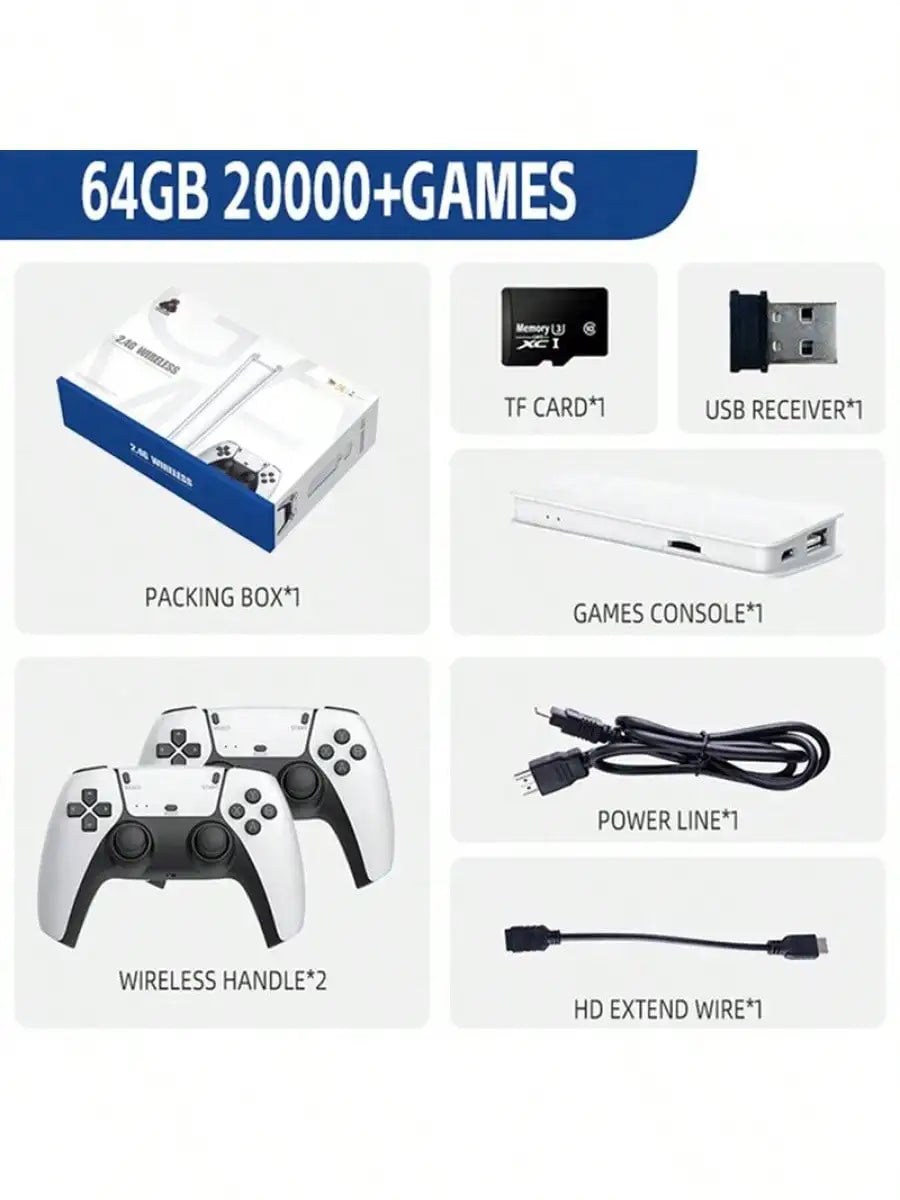 The Retro Video Game Console 64GB brings back classic gaming fun with over 20,000 built-in retro games and dual 2.4G wireless controllers for smooth two-player action. Enjoy your favorite arcade, NES, SNES, Sega, and PlayStation classics in HD quality right on your TV — just plug and play!