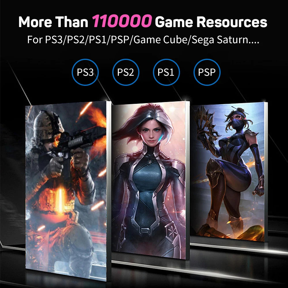 Support 105 game collections and emulators, compatible with PS3/PS2/PS1/PSP/Game Cube/Sega Saturn/DC/N64/MD, etc.