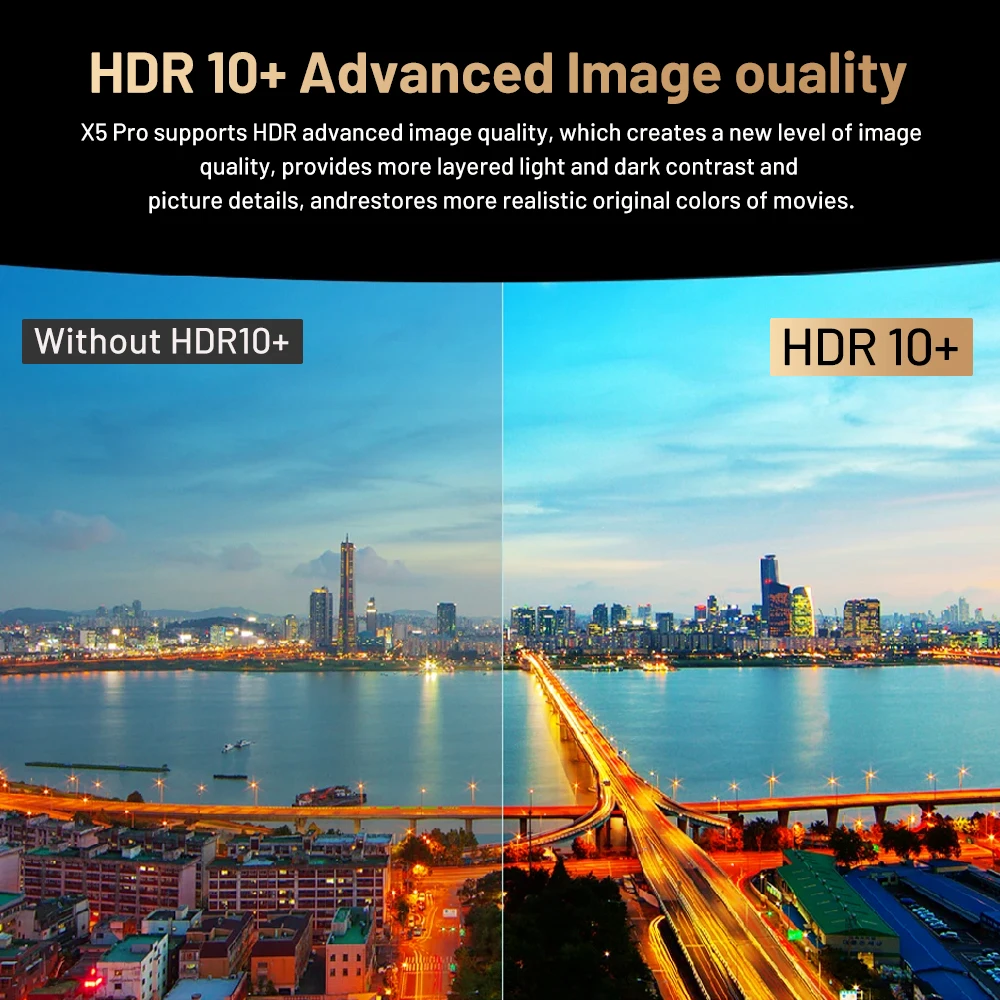 X5 Pro supports HDR+advanced image quality, which creates a new level of image quality, provides more layered light and dark contrast and picture details, and restores more realistic original colors of movies