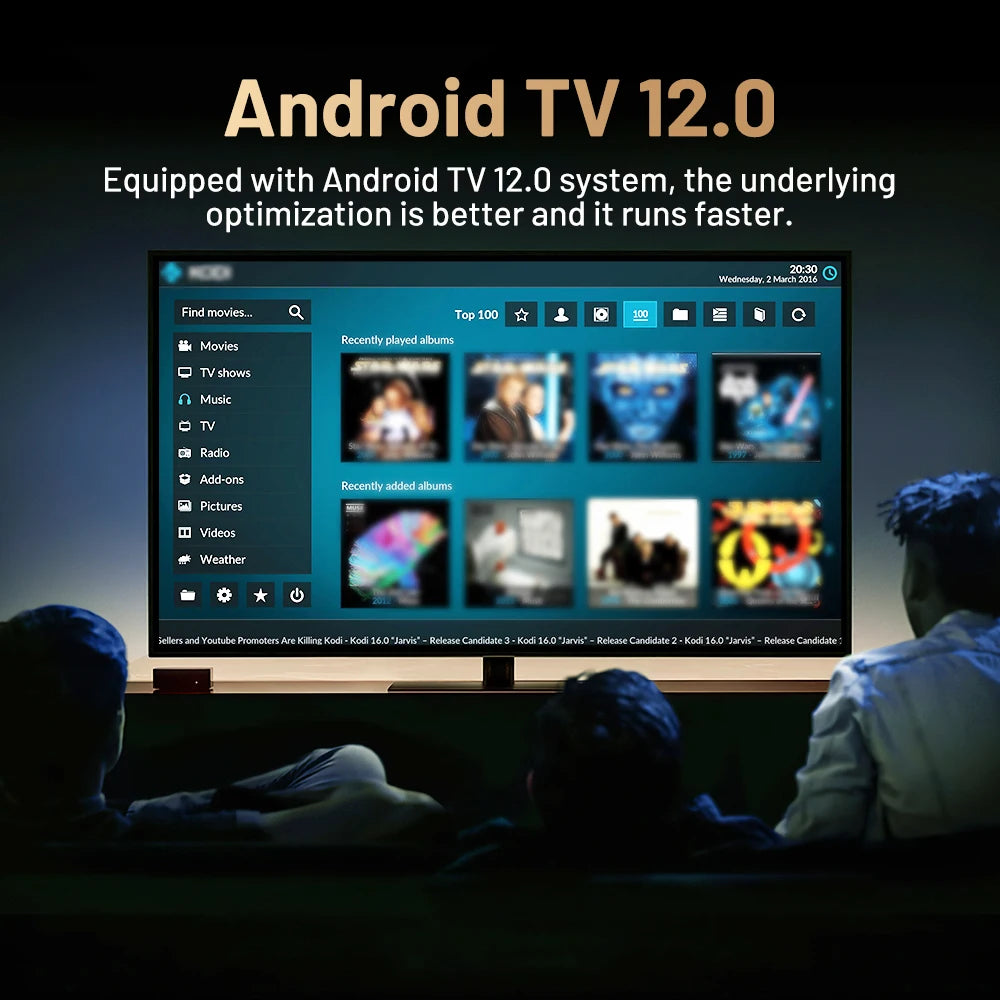 Equipped with Android TV 12 system, the underlying optimization is better, the running speed is faster, and it supports the installation of 64-bit Android applications such as ARMv8 64-bitKODI (compared with 32-bit Android applications, 64-bit applications run faster)